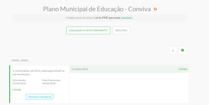 Na ferramenta de Plano Municipal de Educação (PME) é simples verificar os avanços e o quanto falta para o atingimento das metas. Com os dados preenchidos corretamente, tanto do Censo Escolar 2021 quanto de outras informações já registradas, a secretaria pode verificar a evolução de diversos indicadores. Uma possibilidade é o acompanhamento do atendimento quantitativo das crianças da creche ou pré-escola, histórico que pode ser apresentado para outras áreas da prefeitura ou para a sociedade em geral.