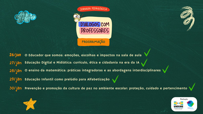 De 26 a 30 de janeiro, a Undime, por meio do Conviva Educação, realizou, a Jornada Pedagógica 2026: Diálogos com Professores. Foi uma semana com debates sobre temas centrais da educação básica, com participação de especialistas para refletir sobre práticas pedagógicas e desafios contemporâneos.