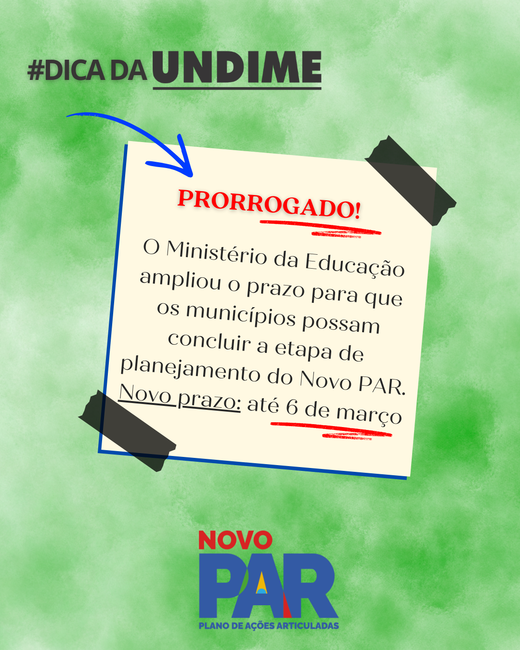 A pedido da Undime, após ter ciência de instabilidades apresentadas no sistema entre os dias 25 e 26 de fevereiro, e com vistas a não prejudicar as redes de ensino que estavam com o planejamento do Novo PAR em curso, o Ministério da Educação (MEC) informou que o prazo final para encerramento dessa etapa foi prorrogado para o dia 6 de março de 2026, sexta-feira.